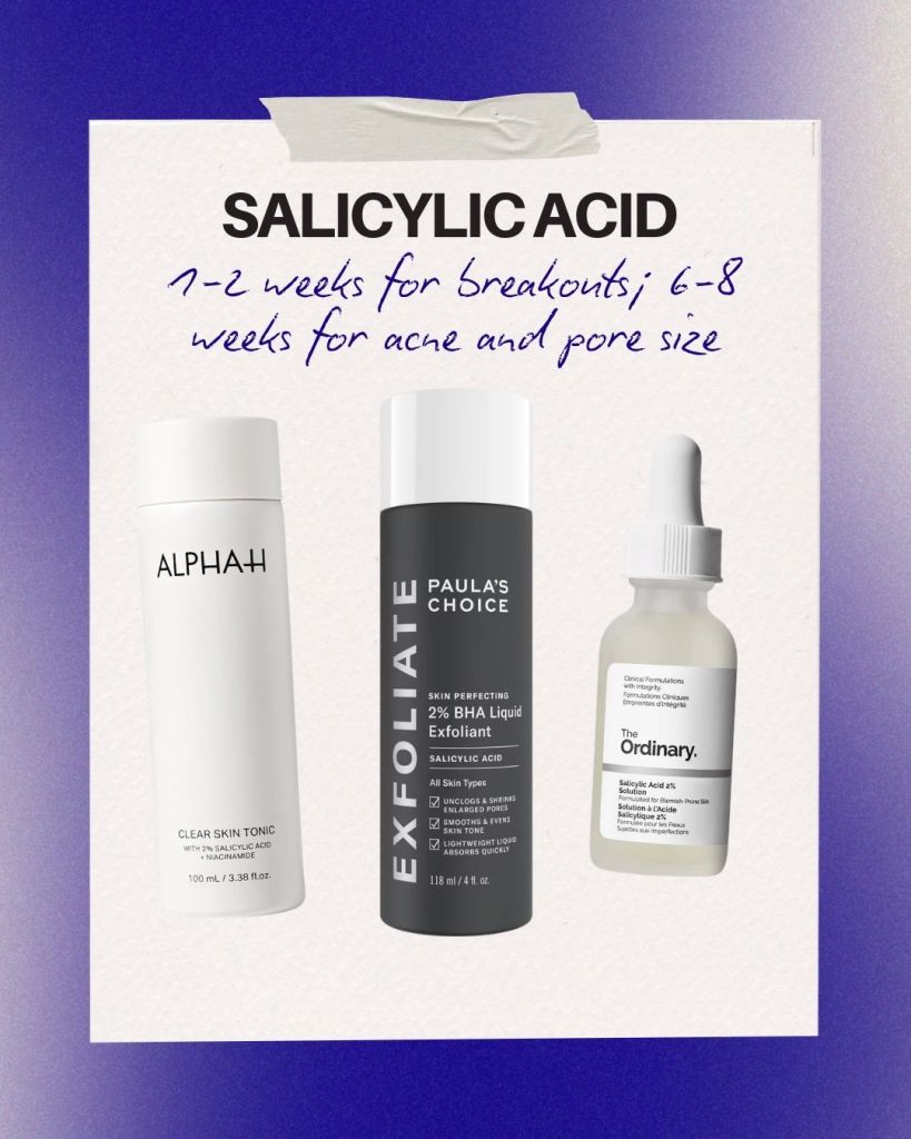 Salicylic acid is a BHA that penetrates into pores to dissolve oil and debris, making it particularly effective for acne-prone and oily skin. Some people see a reduction in active breakouts within the first couple of weeks.
